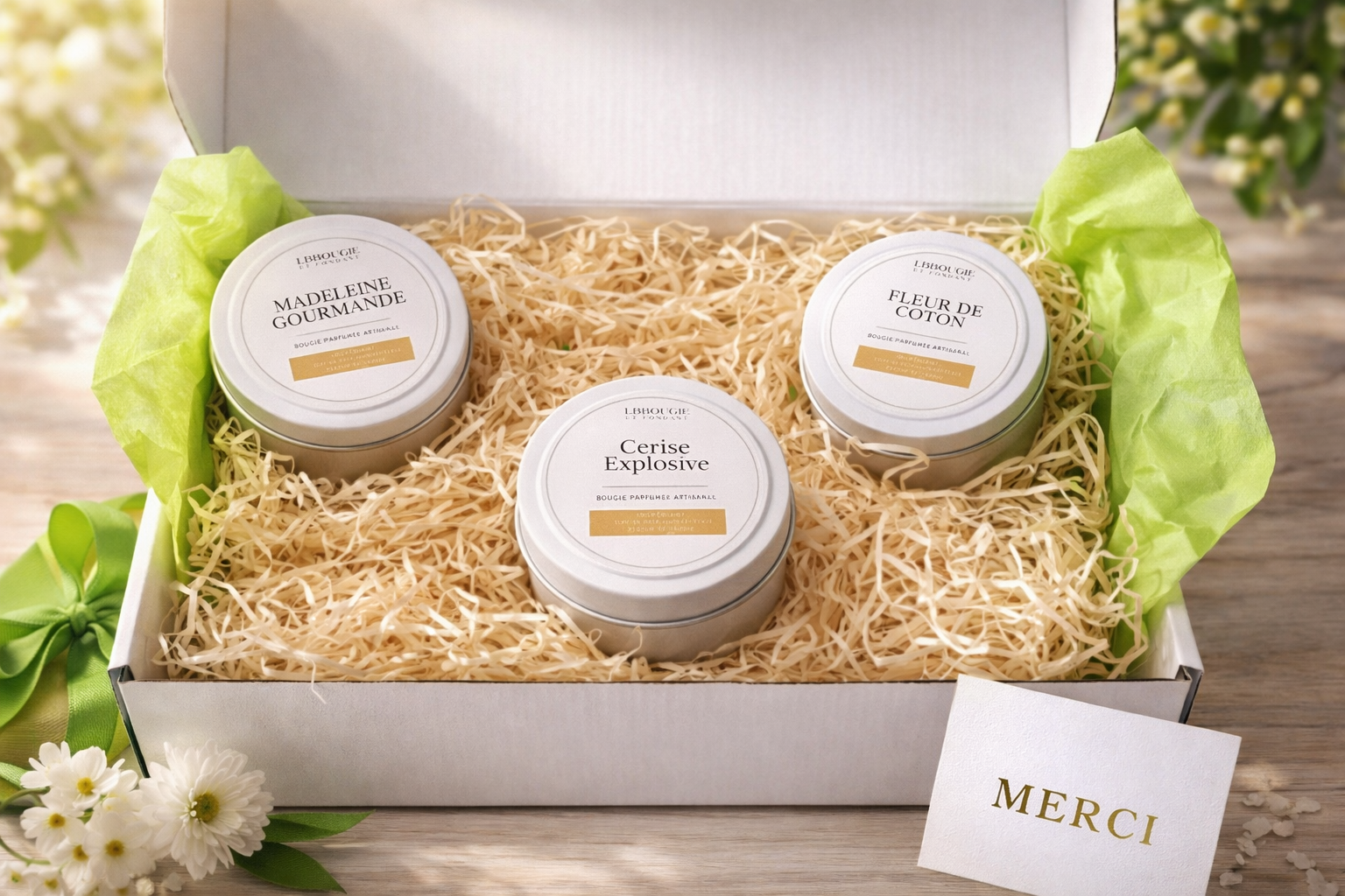 Découvrez notre coffret réunissant trois créations olfactives d'exception. La bougie Madeleine Gourmande enveloppe votre intérieur de notes sucrées et réconfortantes, tandis que Fleur de Coton diffuse une fraîcheur délicate et apaisante. Complétez cette harmonie avec Cerise Noire Explosive, dont les accords intenses et sophistiqués ajoutent une dimension audacieuse à votre ambiance. Un ensemble parfait pour explorer nos signatures ou offrir une expérience sensorielle complète à vos proches.