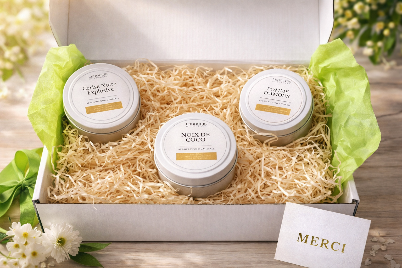 Découvrez notre coffret de trois bougies artisanales aux fragrances envoûtantes. La bougie noix de coco offre une ambiance tropicale et apaisante, tandis que la cerise noire explosive libère des notes intenses et sophistiquées. Complétez cette harmonie avec la bougie pomme d'amour, aux accords fruités et gourmands. Un ensemble parfait pour transformer votre intérieur en véritable havre de sérénité olfactive. Idéal en cadeau ou pour vos propres moments de détente.